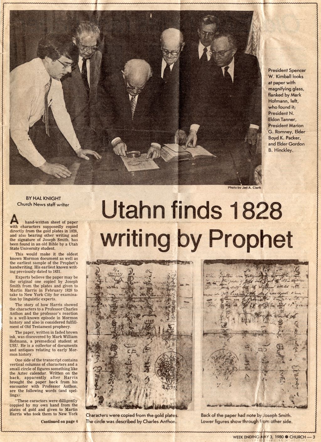Hofmann actually constructed his version to fit Anthon's description of the document, and its discovery made Hofmann's reputation. Dean Jessee, an editor of Joseph Smith's papers and the best-known expert on handwriting and old documents in the Church’s Historical Department, concluded that the document was authentic. The Church announced the discovery of the Anthon Transcript in April and purchased it from Hofmann for more than $20,000. [9]